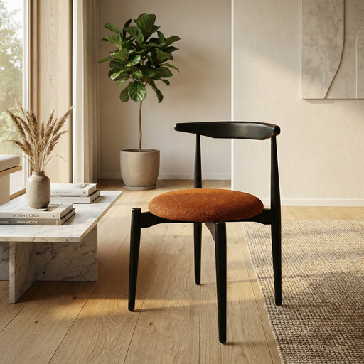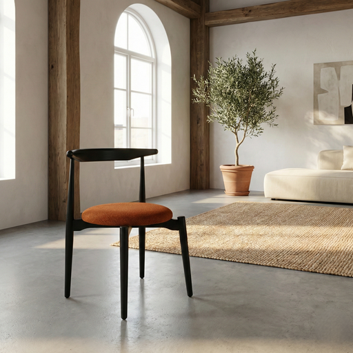 Minimalist çizgileriyle dikkat çeken bu sandalye, siyah ahşap gövdesi ve yan kolları ile modern mekânlara zarif bir dokunuş katar. Yuvarlak formdak...